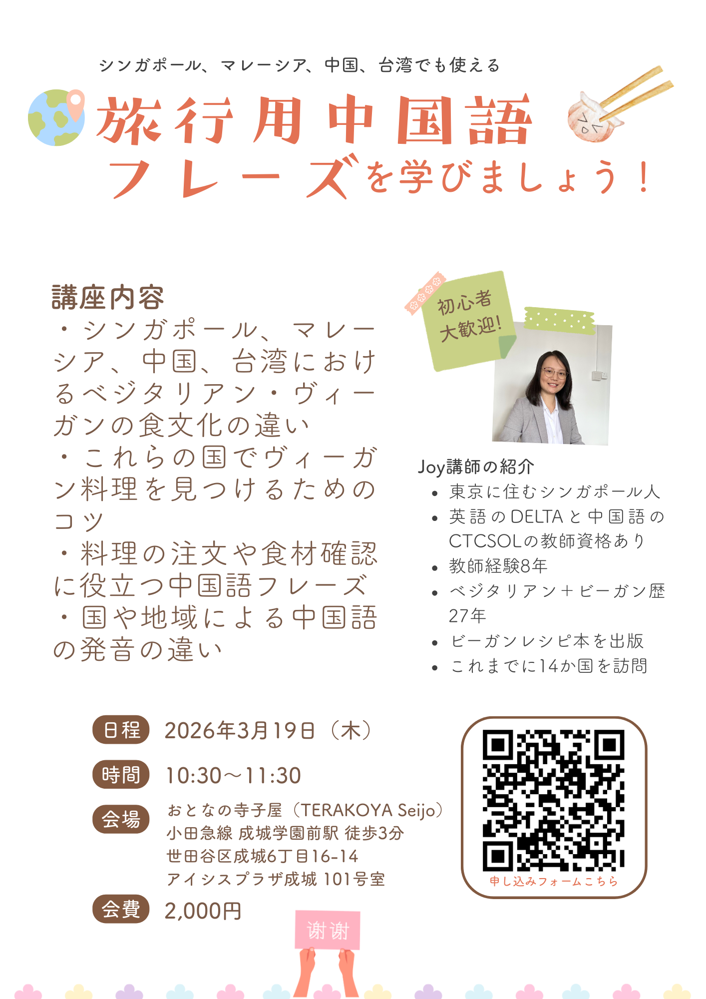 ジョイ先生です!英語と中国語の指導資格を持っています。料理のレシピ本の著者です。